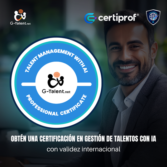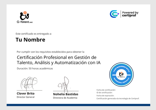 Al aprobar el examen de la Certificación Profesional en Gestión de Talento, Análisis y Automatización con IA, recibirás un certificado oficial respaldado por CertiProf® y G-Talent y una insignia digital verificada en Credly.