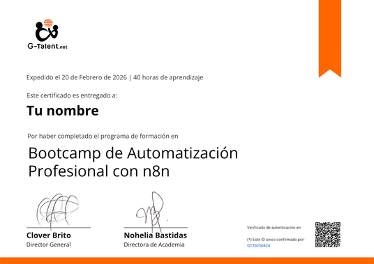 Al aprobar el examen del Bootcamp de Automatización Profesional con n8n, recibirás un certificado oficial que podrás integrar en tu currículum, portafolio profesional o perfiles digitales.