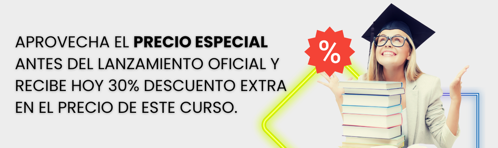 Al comprar hoy aseguras tu lugar con un precio preferencial, además de un 30% de descuento extra sobre el precio rebajado del curso.
