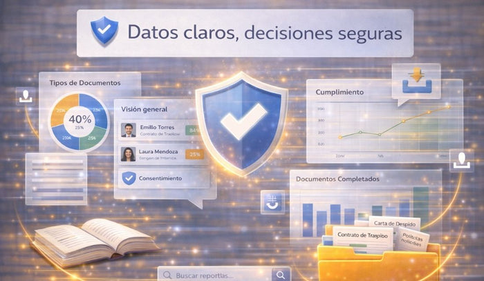 Dashboards que muestran el estado legal de tu organización. % de documentos completos Documentos aceptados Exportación de reportes en PDF.